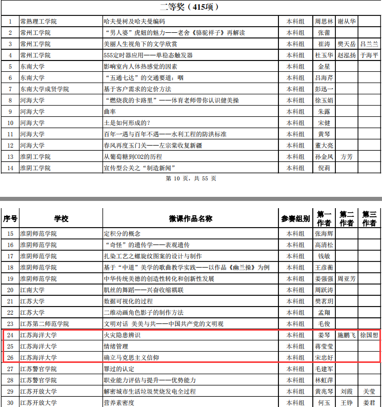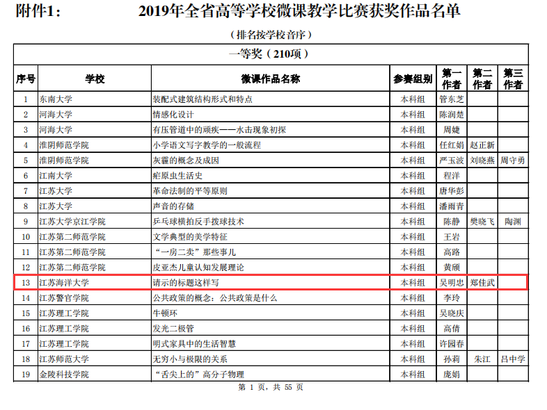 12月12日,江苏省高校微课教学比赛组委会发布2019年全省高等学校微课教学比赛获奖名单。我校推荐参赛的10门微课,9门获奖,其中一等奖1门,二等奖3门,三等奖5门。
