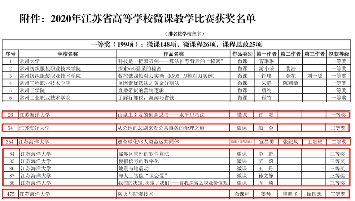 11月19日,江苏省高校微课教学比赛组委会公示2020年全省高等学校微课教学比赛获奖名单。我校9门微课获奖,其中一等奖1门,二等奖2门,三等奖6门。