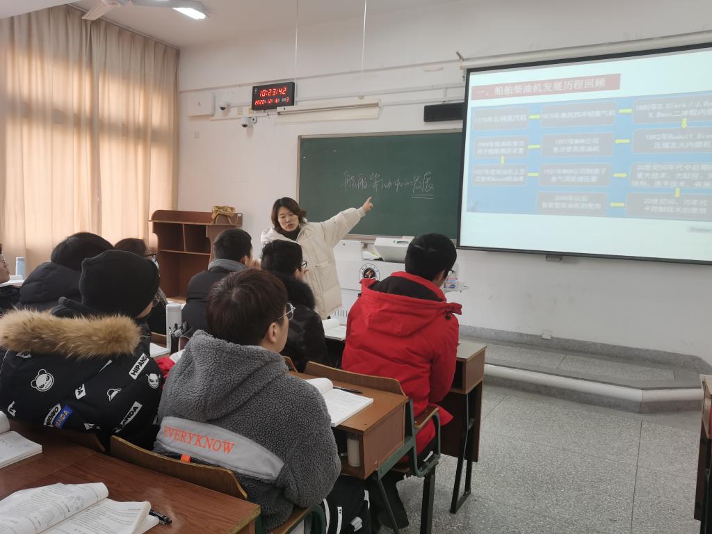 观摩课现场,姜琴老师在授课前分享了比赛现场“以人为本”安全生产观的教学设计,引导学生树立绿水青山就是金山银山的环保理念,理解平安中国、健康中国、绿色中国的发展理念,接着通过播放动画短视频导入教学主题——互助型安全文化,通过启发引导、电影素材、名人名言、典型案例等引导学生树立安全生产、遵规守纪、维护荣誉、关注他人的全局意识。刘洁老师首先回顾船舶柴油机发展历程,引导学生学习科学家们刻苦钻研、不懈努力、推动人类科技进步的精神,接着通过图表对比、数据分析、地图展示、归纳总结,引导学生树立保护环境、保护地球家园的环保理念,帮助学生理解人类命运共同体的理念内涵。宗霞老师通过对比中国与欧洲古代手工艺设计发展史,引导学生正视中外优秀文化,增强文化自信,整堂课程自然流畅,思路清晰,重难点把握得当,理论联系实际,展现了课程思政育人功能。
