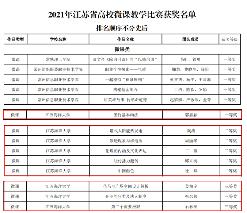 12月9日,江苏省高校微课教学比赛组委会公布2021年全省高校微课教学比赛获奖名单。我校推荐参赛的10门微课,9门获奖,其中一等奖1门,二等奖5门,三等奖3门。