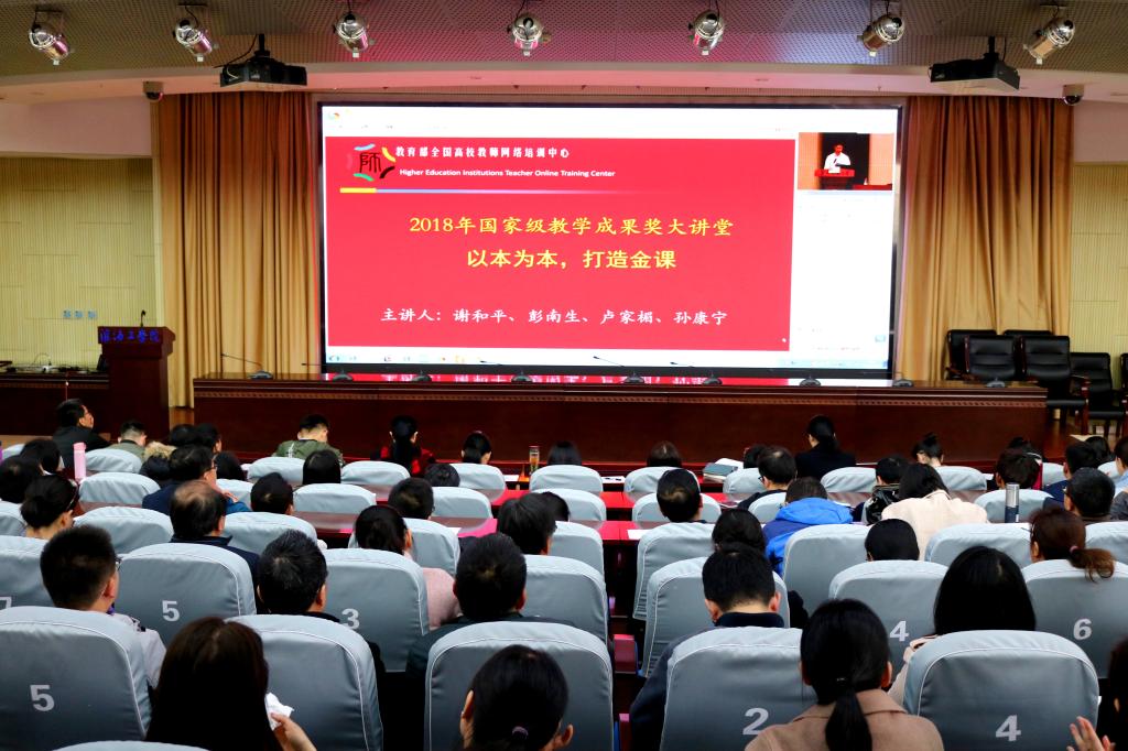 为深入贯彻全国教育大会和全国高等学校本科教育工作会议精神,落实教育部《关于狠抓新时代全国高等学校本科教育工作会议精神落实的通知》(教高函[2018]8号)要求,4月19日-20日,我校组织教师参加“2018年国家级教学成果奖大讲堂——以本为本,打造金课”专题学习。本次学习活动安排在会议中心黄海厅和艺术楼报告厅两个分会场举行,各二级学院近900名教师参加了学习。学习培训会由教务处副处长赵巍主持。